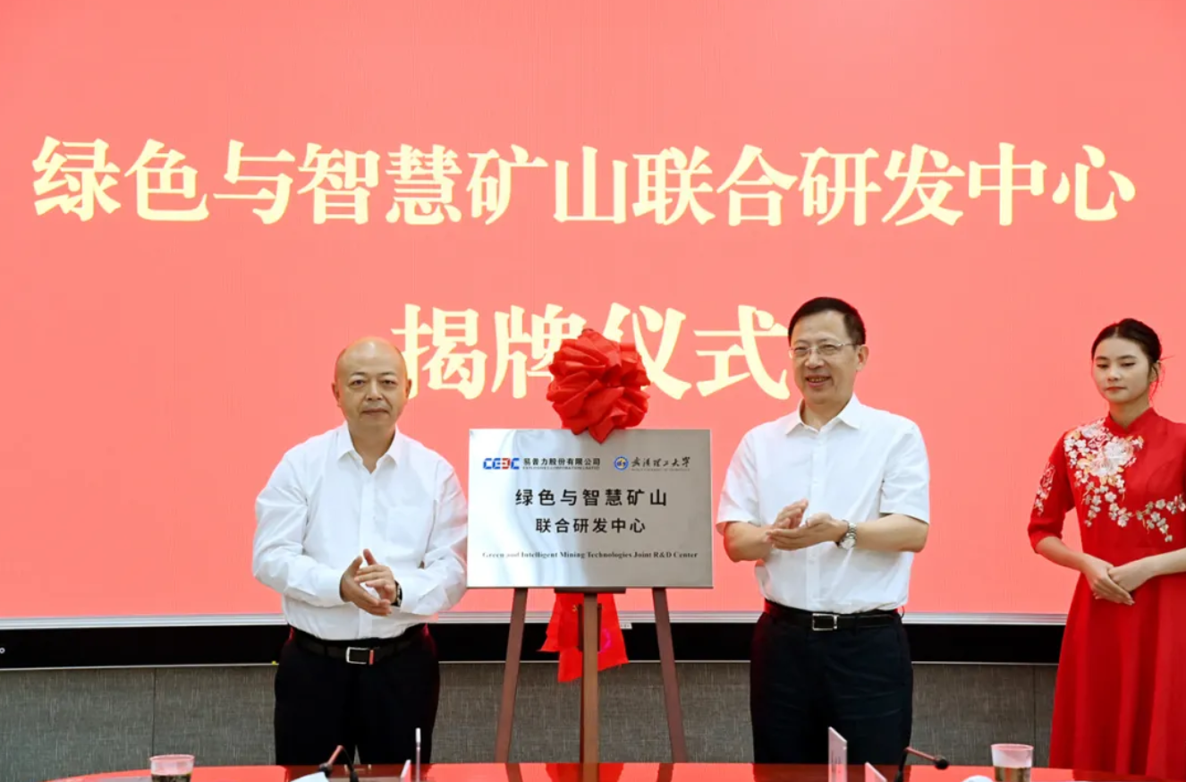 党委书记信思金和易普力党委书记、董事长付军为“易普力-武汉理工绿色与智慧矿山联合研发中心”揭牌