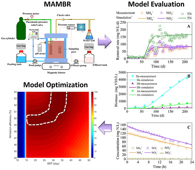 反硝化厌氧甲烷氧化(DAMO)能够进一步提高生物脱氮效率并降低强温室气体CH4的排放。DAMO微生物主要包括DAMO细菌和DAMO 古菌。它们可以利用污水或污泥厌氧处理产生的CH4作为电子供体,实现厌氧甲烷氧化和反硝化,在将NO3--N和NO2--N转化为N2的同时,强温室气体CH4被氧化去除。然而DAMO微生物的缓慢生长特性阻碍了这一技术的应用。同时,DAMO与Anammox耦合工艺中不同微生物之间竞争和协同作用还缺乏进一步的表征,其在悬浮生长系统中的动力学研究鲜少报道。针对这一问题,彭来教授团队构建了描述悬浮生长系统中DAMO和Anammox耦合工艺的数学模型,利用批次反应器和膜曝气膜生物反应器(MAMBR)中的实验数据对模型进行校准和验证。模型成功预测了不同运行条件下微生物群落的变化和氮素的去除。动力学参数分析表明DAMO古菌在悬浮生长系统中取得了快速生长速率和高生长得率。模型模拟结果进一步揭示了通过控制污泥停留时间能够在MAMBR中成功截留DAMO古菌和Anammox细菌,淘汰DAMO细菌,从而实现经济高效的生物脱氮。这一模型的提出明晰了DAMO和Anammox的耦合过程,为可持续废水处理新技术的设计与运行提供了新思路。