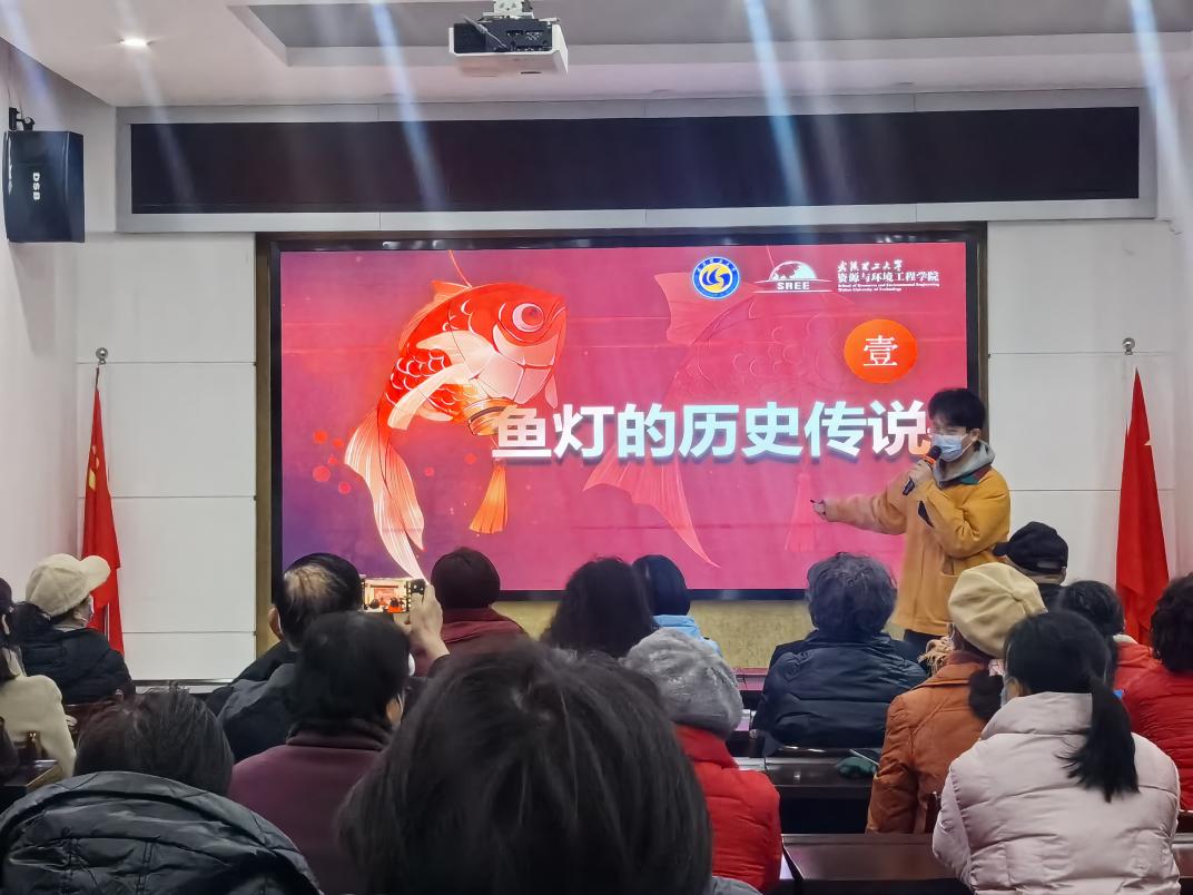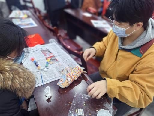 同心协力做鱼灯,映暖岁月情常在。活动伊始,团支书游子豪用精美的PPT向老人们展示了鱼灯的制作方法,详细解读了鱼灯的制作步骤,结合实际案例,将环保的鱼灯展现在众人面前。在中华文化中,“鱼”与“余”谐音,象征着年年有余,寓意美满幸福与吉祥。理论学习后,团支部成员带领老人们开始手工实践。在本次活动中,同学们大力推广“环保鱼灯”的做法,身体力行将环保理念与暖冬活动相结合。鱼身的搭建、鱼头的雕琢、整体的组装都需要团队的配合,但同学们与老人们同心协力,使一个个鱼灯翩然跃入眼前。