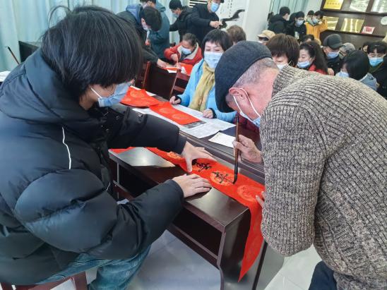 挥毫绘就新春景,铺纸书成盛世情。对联是中华传统文化的重要一环,是迎接新年的重要习俗,是人们对安居乐业、福临满家的向往。在活动现场,老人们热情高涨,积极参与。同学们精心挑选内容和他们一起完成这幅美好作品。红纸翻腾,欢笑声不断响起,年味满盈。同学们与老人一边交流,一边书写,或将对联内容与当下结合,表达对当下新时代的赞美;或将春联内容与时尚结合,表达对顺应时代、引领潮流的期许;或将对联内容与未来愿望相结合,表达对未来的向往与期待。活动结束之后,同学们跟老人决定将对联作为礼物送给亲朋好友,传递对美好生活的向往与期待。