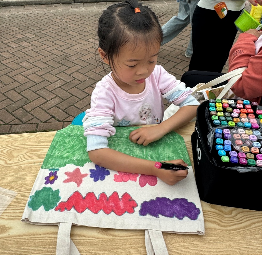 上午9时,越园食堂前的员工们准备好了待绘制的素白帆布袋。环境工程专业的志愿者们支起调色台,将矿物颜料分装成小巧的"地球色卡",向参与者讲解:"这些取自天然矿物的颜料,就像我们守护的自然资源,既环保又充满生命力。