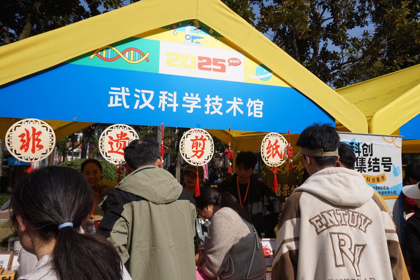 除了底蕴深厚的主题展览与话剧表演,丰富多彩的传统文化体验活动也让同学们乐在其中。在武汉科学技术馆搭建的 “非遗剪纸” 摊位前,大家纷纷动手体验,在剪刀开合间感受非遗文化的独特魅力与传统技艺的精妙。这场传统与生活的跨界互动,不仅厚植了同学们的民族文化自信,更在协作创作的过程中拉近了彼此距离,让团支部凝聚力在欢声笑语中悄然升温。