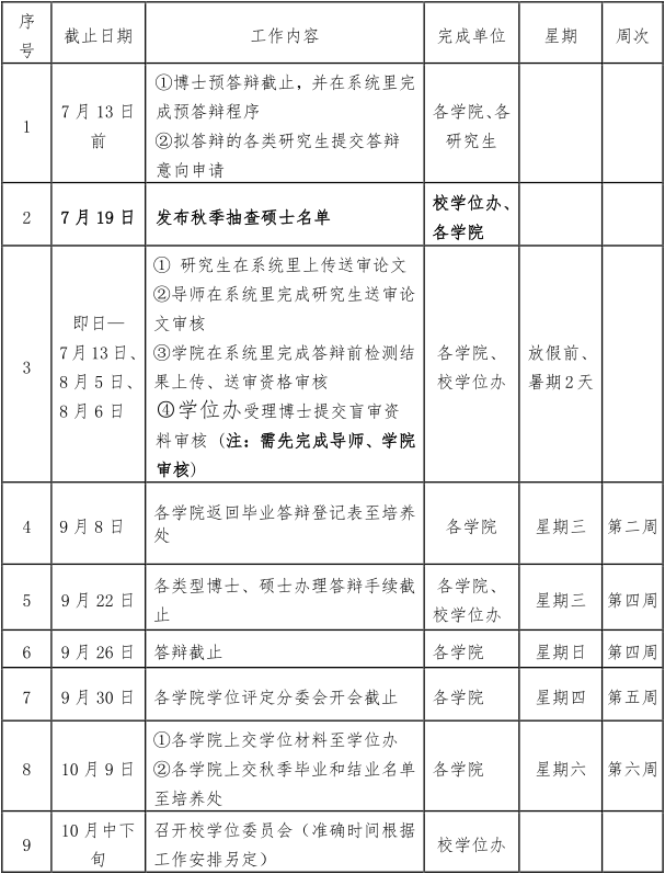 各类研究生答辩表决票盖章办理截止日期为2021年9月22日,答辩截止日期为2021年9月26日。各学位评定分委员会开会截止日期为2021年9月30日,各公司报送学位材料及秋季毕业、结业名单截止日期为2021年10月9日,其中秋季毕业、结业名单报送至培养处。